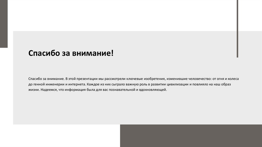 Спасибо за внимание!Спасибо за внимание. В этой презентации мы рассмотрели ключевые изобретения, изменившие человечество: от огня и колеса