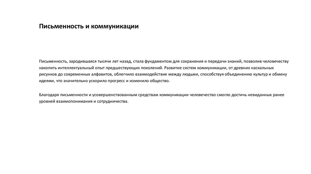 Письменность и коммуникацииПисьменность, зародившаяся тысячи лет назад, стала фундаментом для сохранения и передачи знаний, позволив человечеству