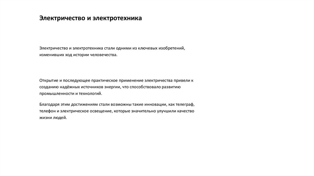Электричество и электротехникаЭлектричество и электротехника стали одними из ключевых изобретений,