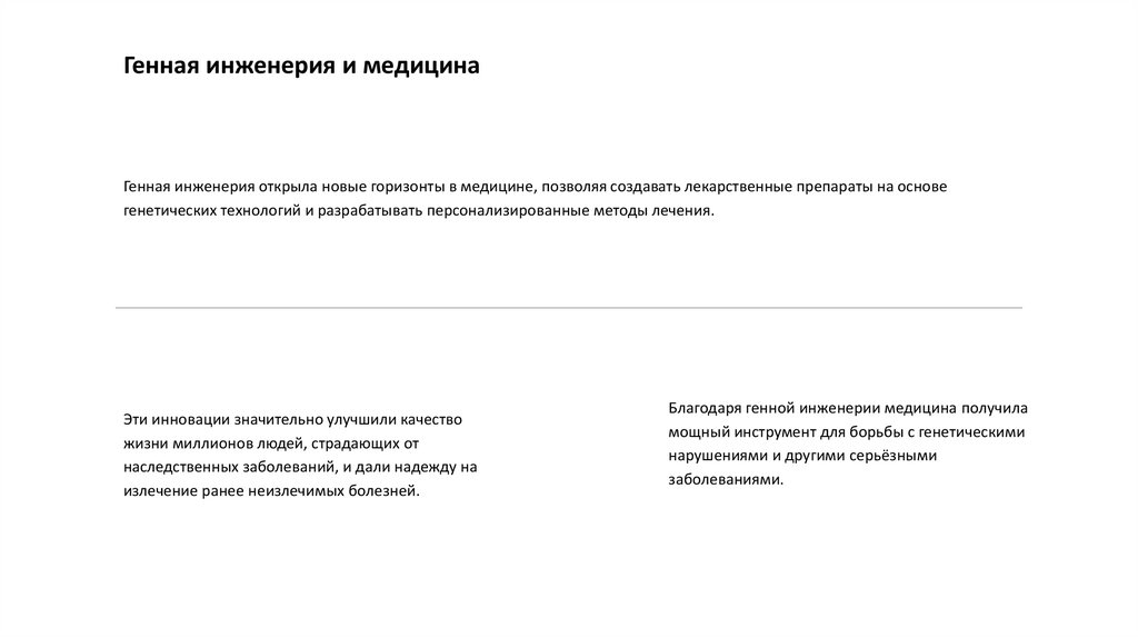 Генная инженерия и медицинаГенная инженерия открыла новые горизонты в медицине, позволяя создавать лекарственные препараты на основе