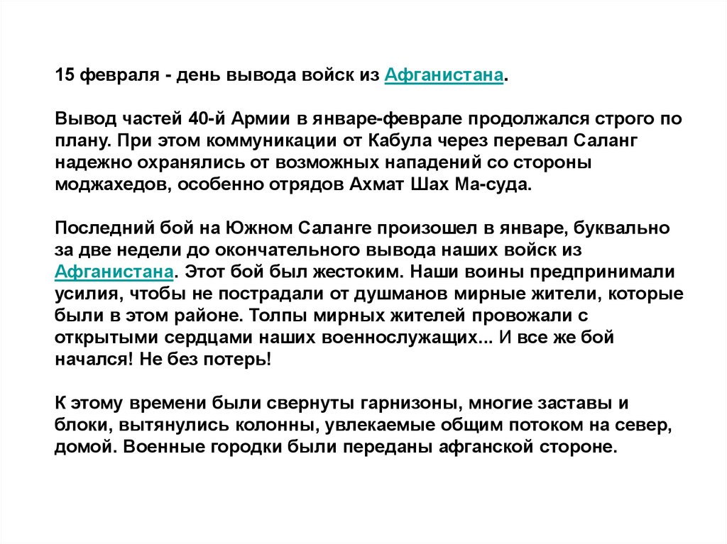 15 февраля - день вывода войск из Афганистана.Вывод частей 40-й Армии в январе-феврале продолжался строго по