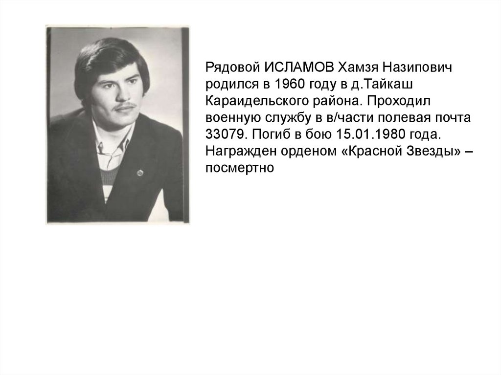 Рядовой ИСЛАМОВ Хамзя Назиповичродился в 1960 году в д.Тайкаш