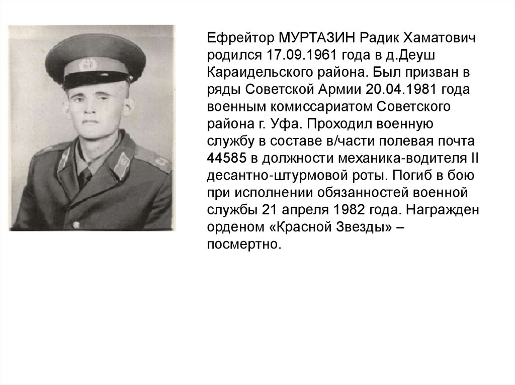 Ефрейтор МУРТАЗИН Радик Хаматовичродился 17.09.1961 года в д.Деуш
