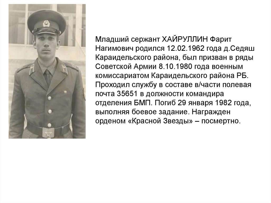 Младший сержант ХАЙРУЛЛИН ФаритНагимович родился 12.02.1962 года д.Седяш