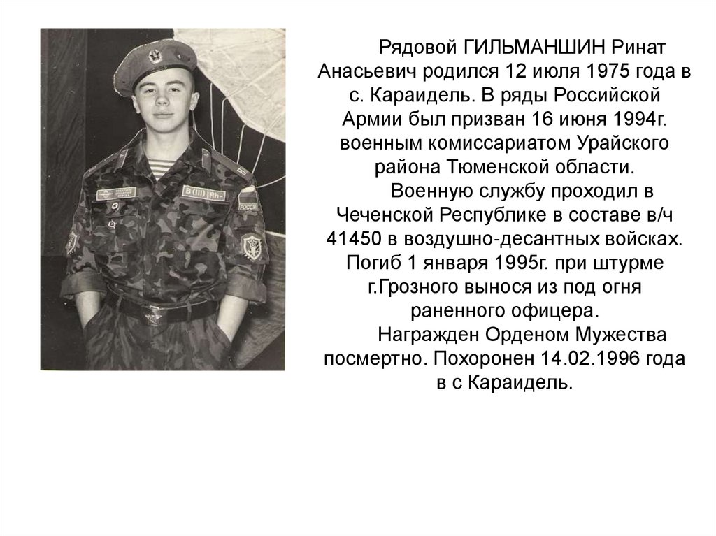 Рядовой ГИЛЬМАНШИН РинатАнасьевич родился 12 июля 1975 года в