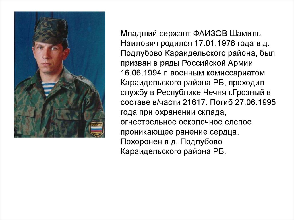 Младший сержант ФАИЗОВ ШамильНаилович родился 17.01.1976 года в д.