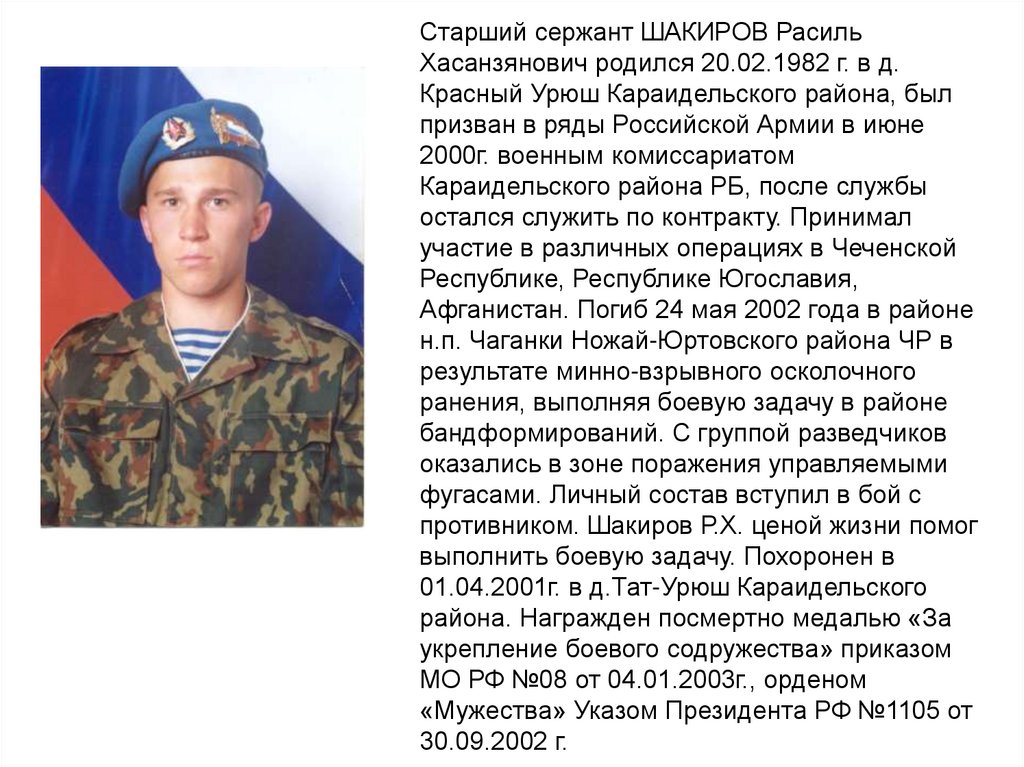Старший сержант ШАКИРОВ РасильХасанзянович родился 20.02.1982 г. в д.