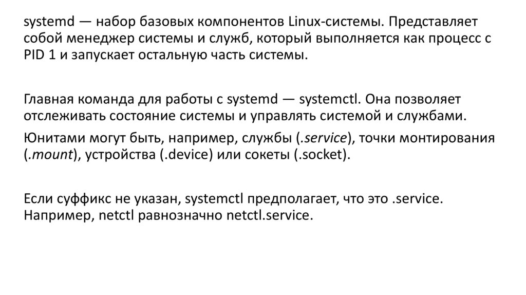 systemd — набор базовых компонентов Linux-системы. Представляетсобой менеджер системы и служб, который выполняется как процесс с