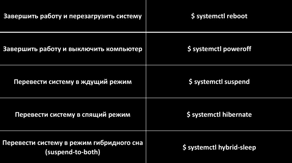 Завершить работу и перезагрузить систему$ systemctl reboot