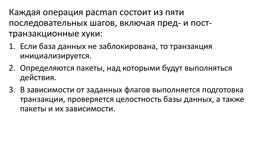 Каждая операция pacman состоит из пятипоследовательных шагов, включая пред- и посттранзакционные хуки: