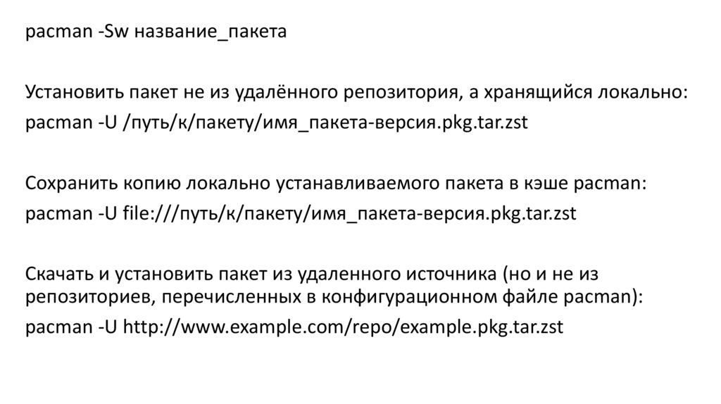 pacman -Sw название_пакетаУстановить пакет не из удалённого репозитория, а хранящийся локально: