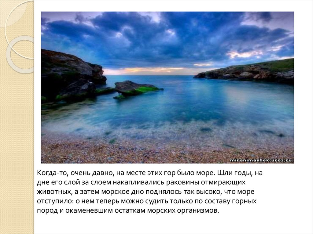 Когда-то, очень давно, на месте этих гор было море. Шли годы, надне его слой за слоем накапливались раковины отмирающих