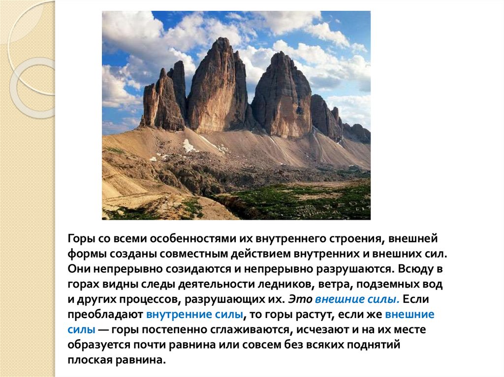 Горы со всеми особенностями их внутреннего строения, внешнейформы созданы совместным действием внутренних и внешних сил.