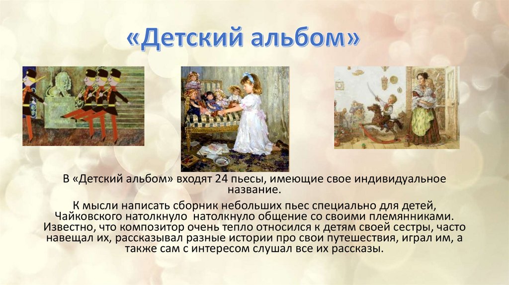 В «Детский альбом» входят 24 пьесы, имеющие свое индивидуальноеназвание.