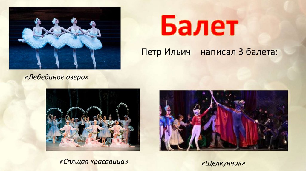 Петр Ильич написал 3 балета:«Лебединое озеро»