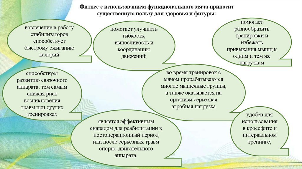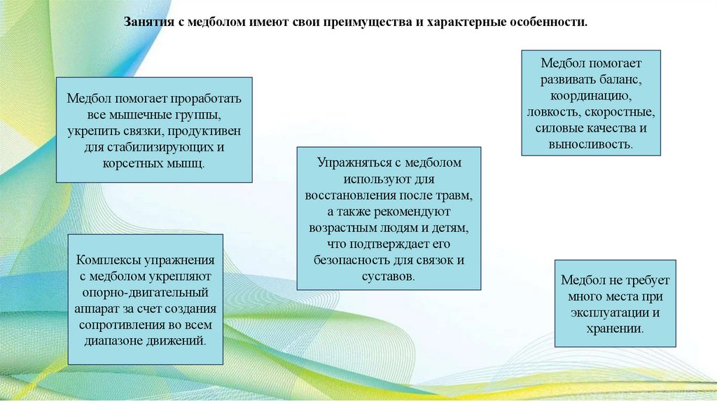 Важным преимуществом тренировок с медболом также является то, что он абсолютнонетравмоопасен; при работе с этим снарядом исключены разрывы и растяжения, зато пользу при