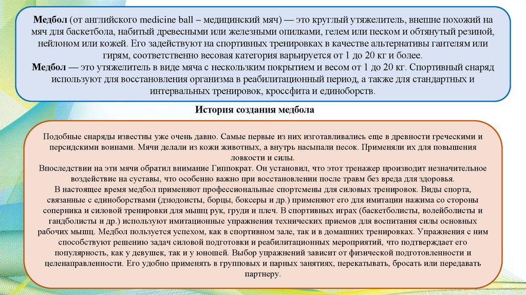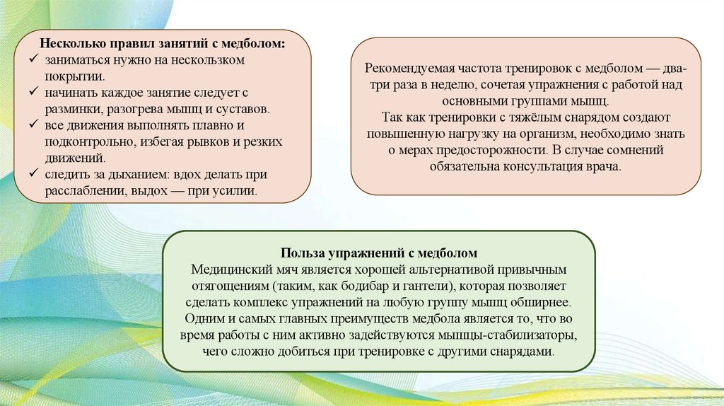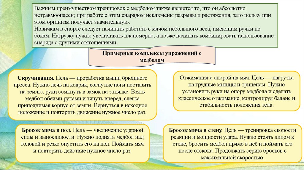 Упражнения с медболом имеют большой тренировочный эффект. В зависимости отнаправленности и уровня подготовленности подбирается комплекс упражнений и