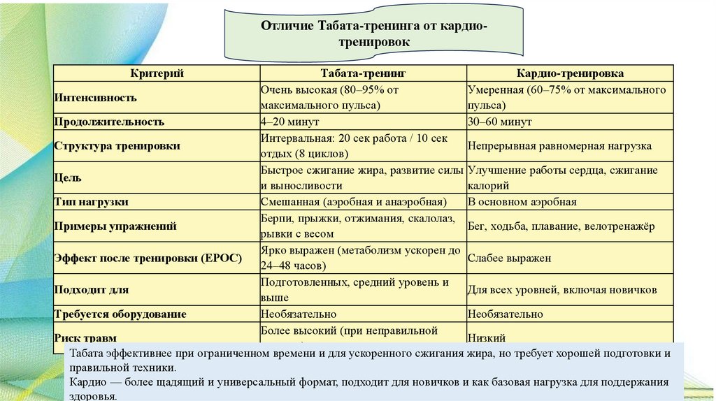 Отличие Табата-тренинга от кардиотренировокКритерий