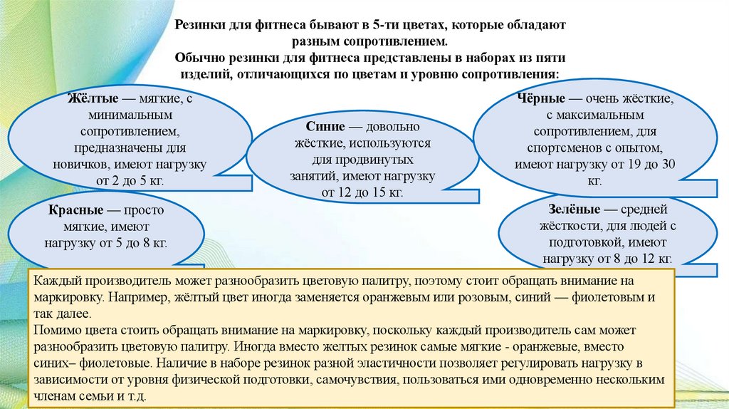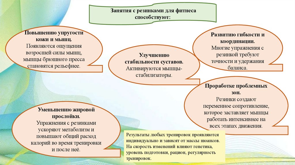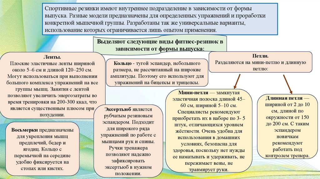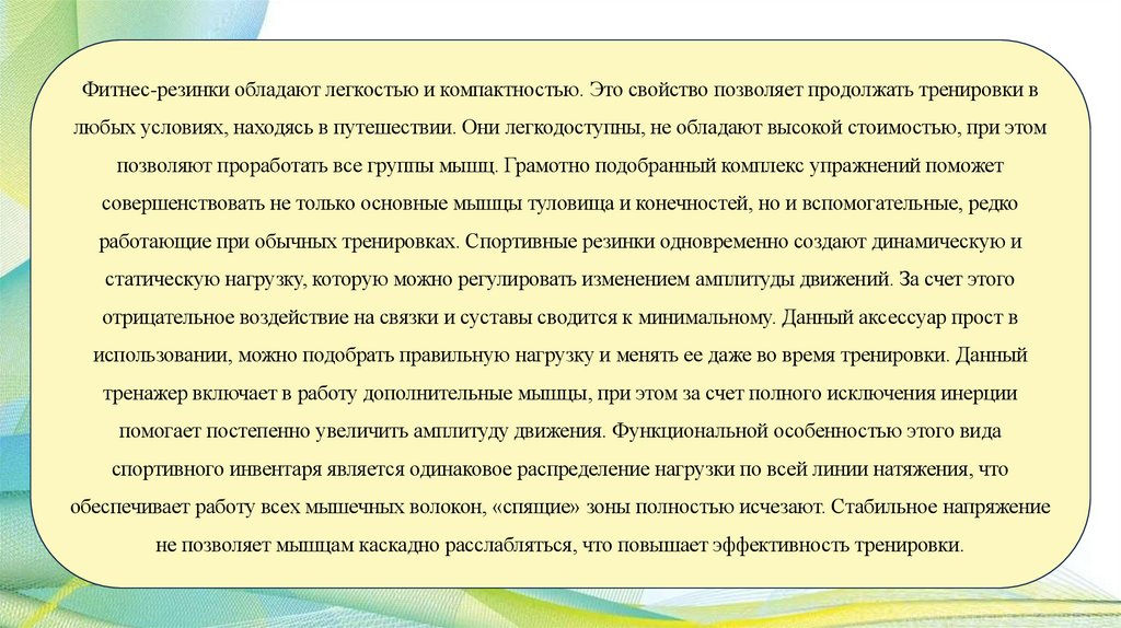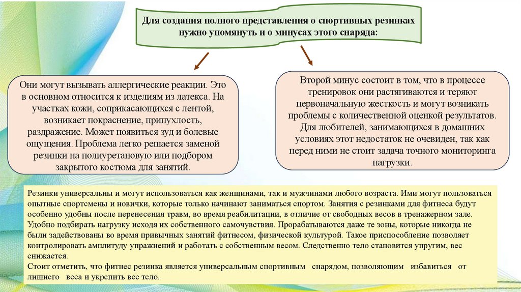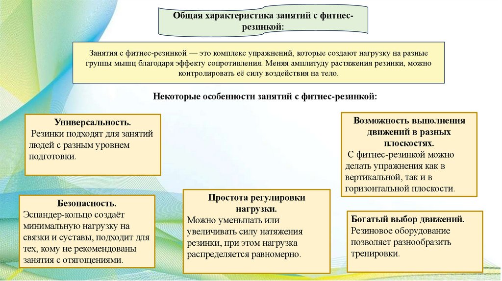 Общая характеристика занятий с фитнесрезинкой:Занятия с фитнес-резинкой — это комплекс упражнений, которые создают нагрузку на разные