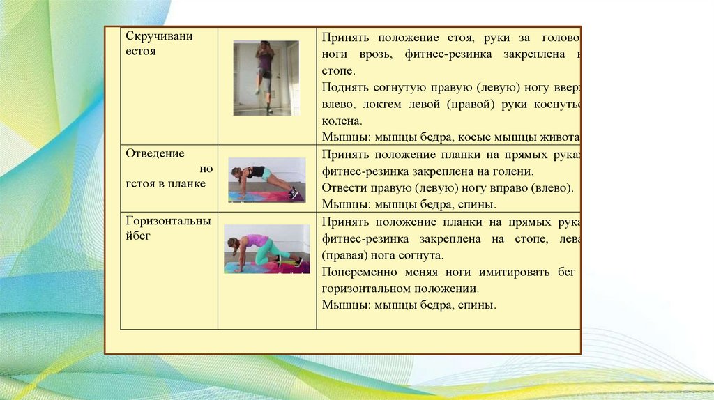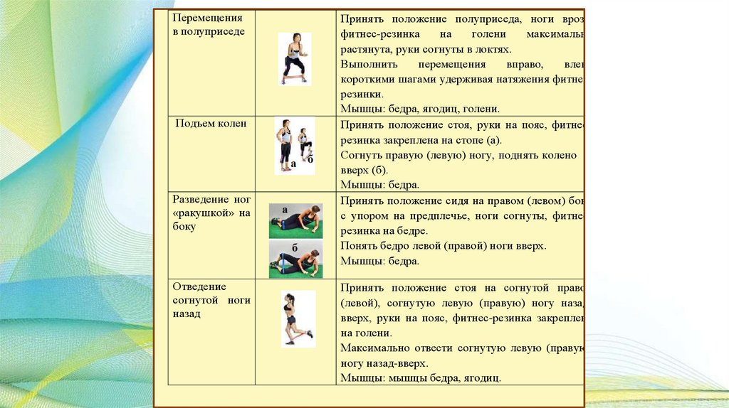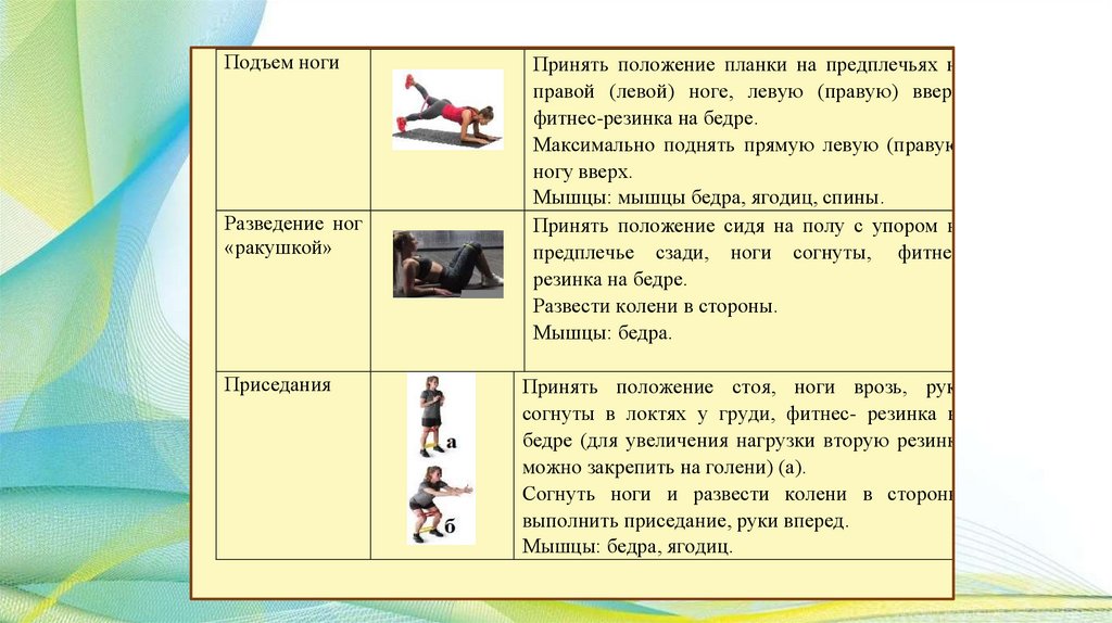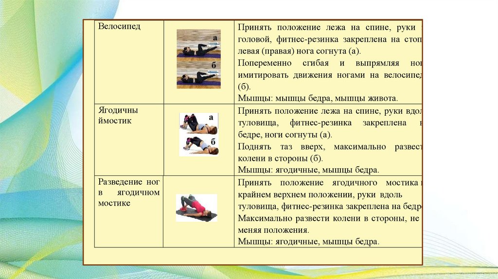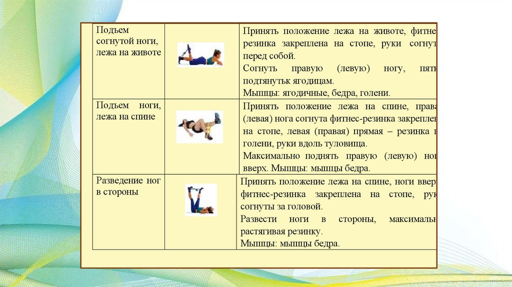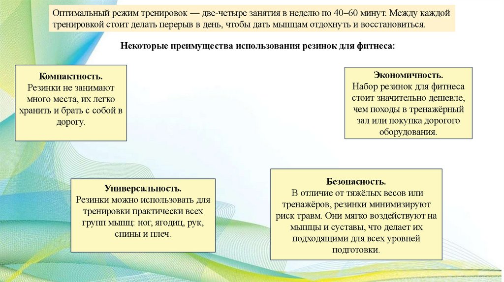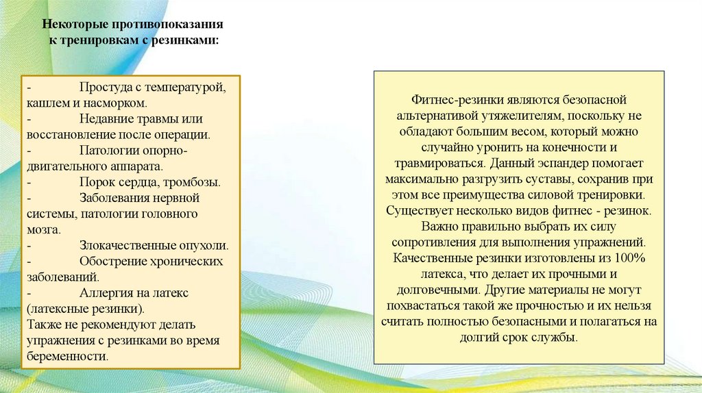 Общая характеристика занятий с фитнесрезинкой:Занятия с фитнес-резинкой — это комплекс упражнений, которые создают нагрузку на разные