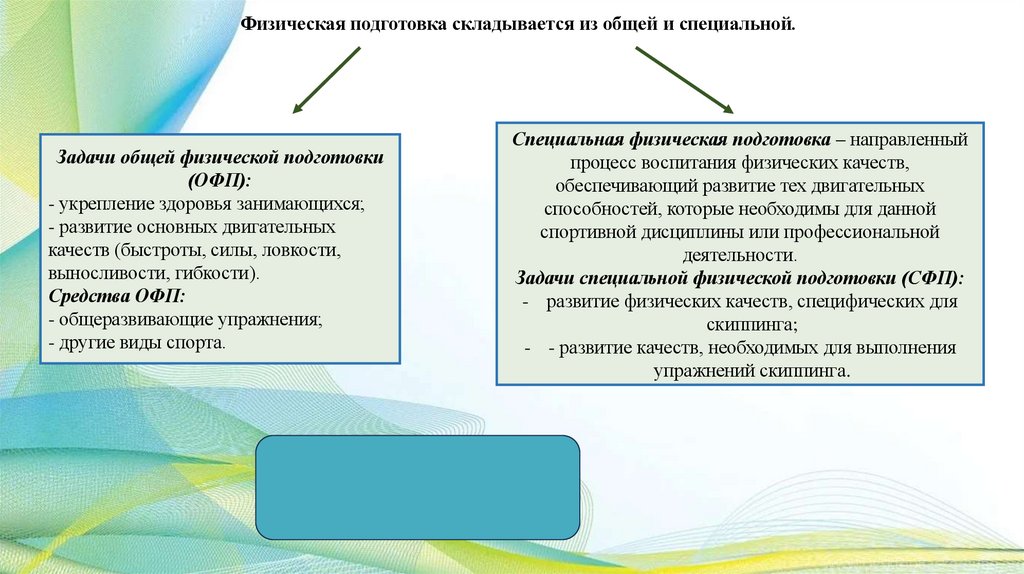 Физическая подготовка складывается из общей и специальной.Задачи общей физической подготовки