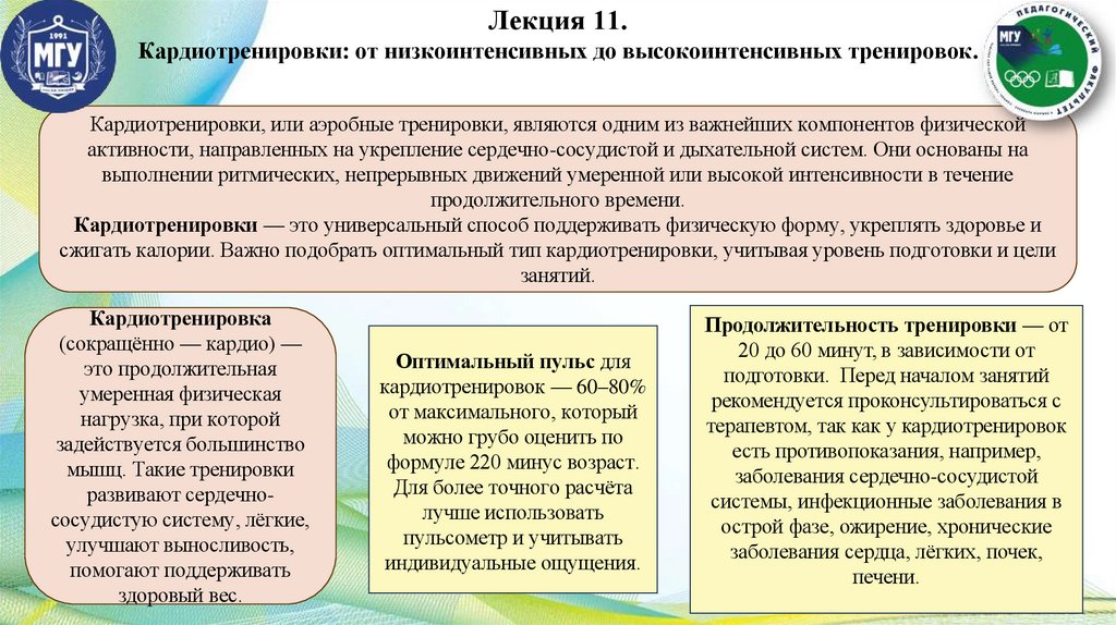 Лекция 11.Кардиотренировки: от низкоинтенсивных до высокоинтенсивных тренировок.