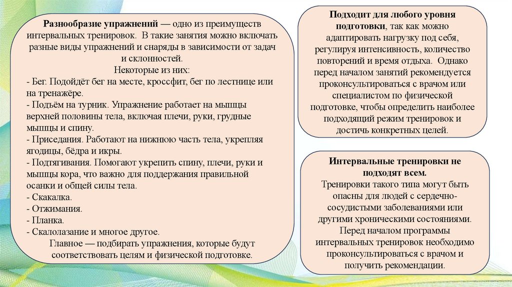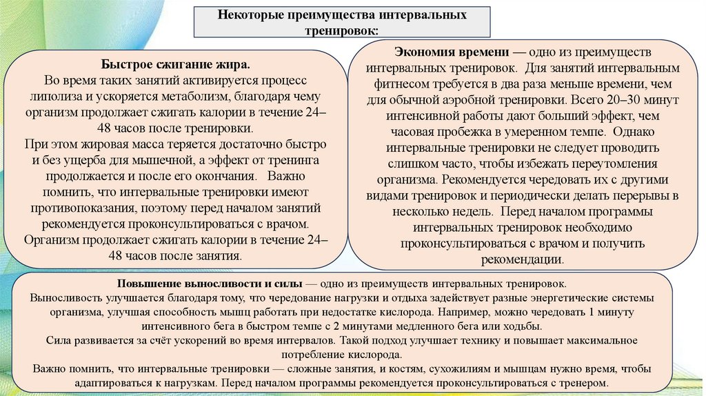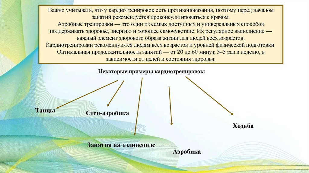 Важно учитывать, что у кардиотренировок есть противопоказания, поэтому перед началомзанятий рекомендуется проконсультироваться с врачом.
