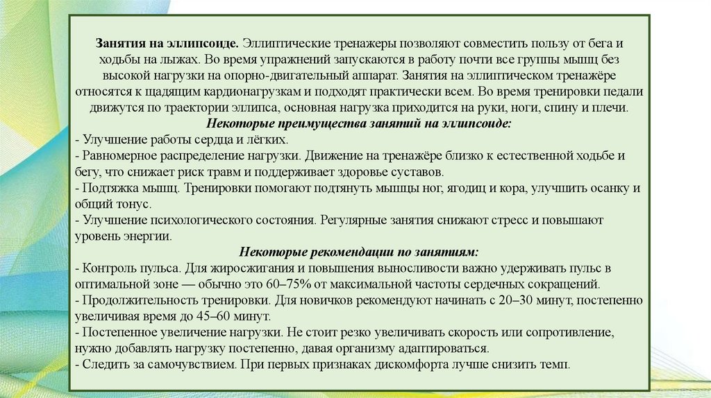 высокой нагрузки на опорно-двигательный аппарат. Занятия на эллиптическом тренажёре