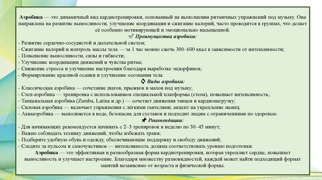 Аэробика — это динамичный вид кардиотренировки, основанный на выполнении ритмичных упражнений под музыку. Онанаправлена на развитие выносливости, улучшение координации и сжигание калорий, часто проводится в группах, что делает