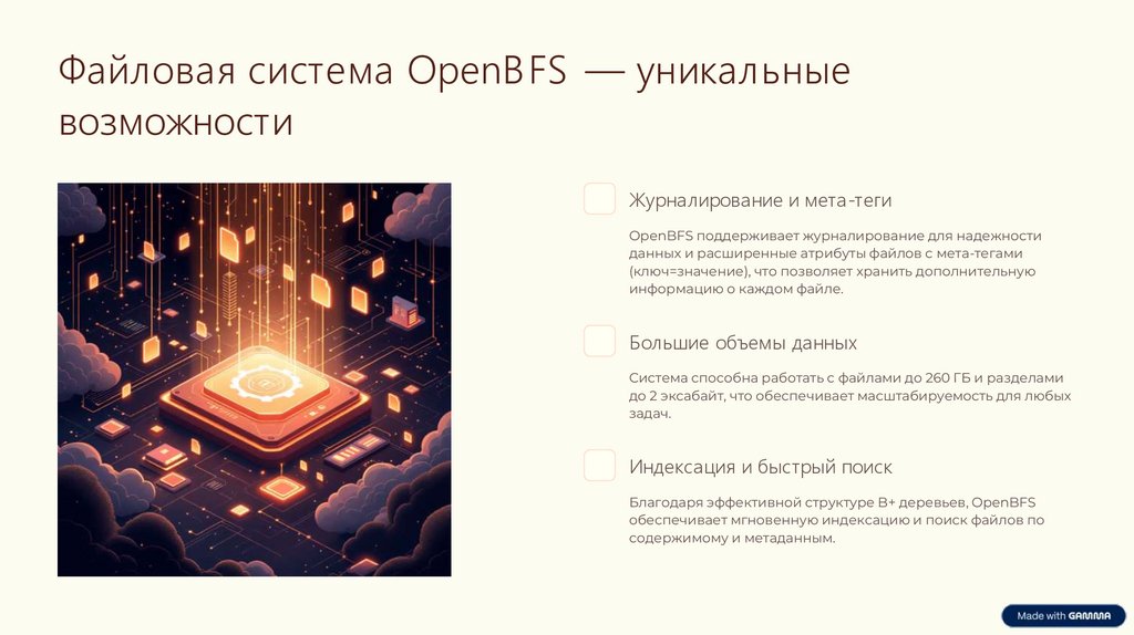 Благодаря эффективной структуре B+ деревьев, OpenBFS