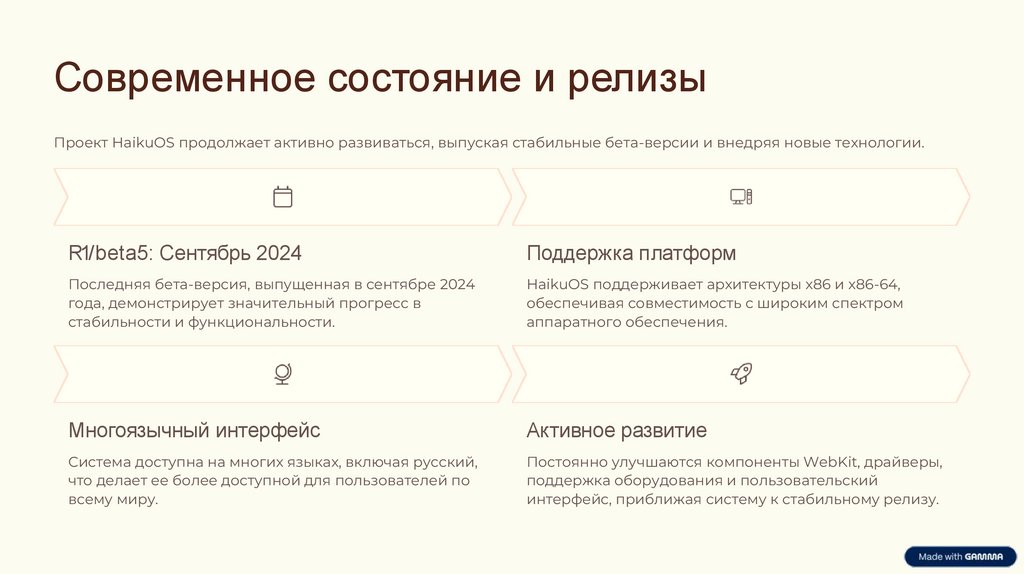 Современное состояние и релизыПроект HaikuOS продолжает активно развиваться, выпуская стабильные бета-версии и внедряя новые технологии.