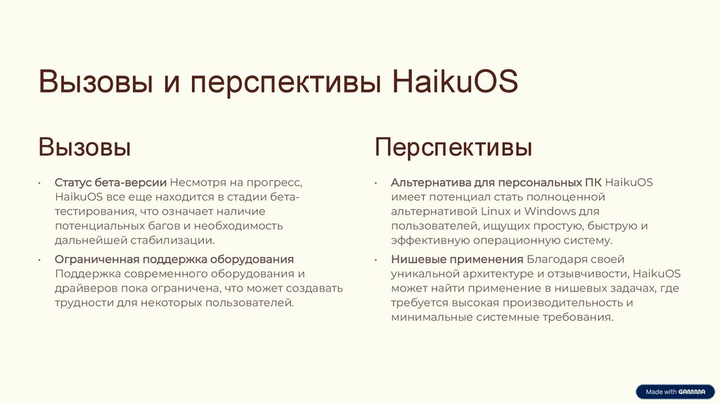 HaikuOS, обеспечивая его развитие и устойчивость.