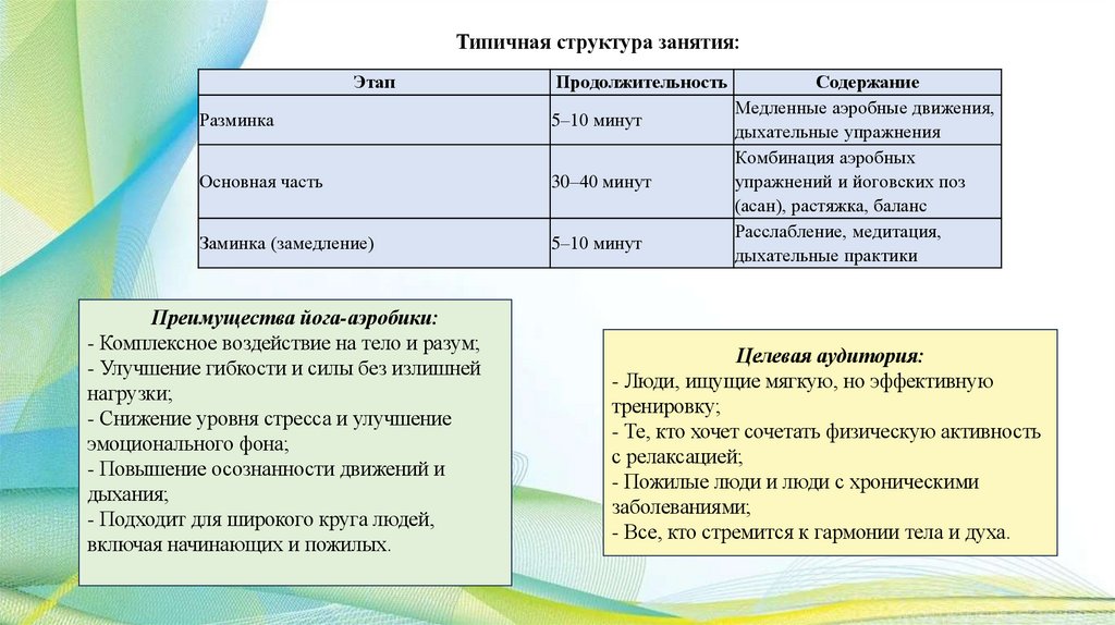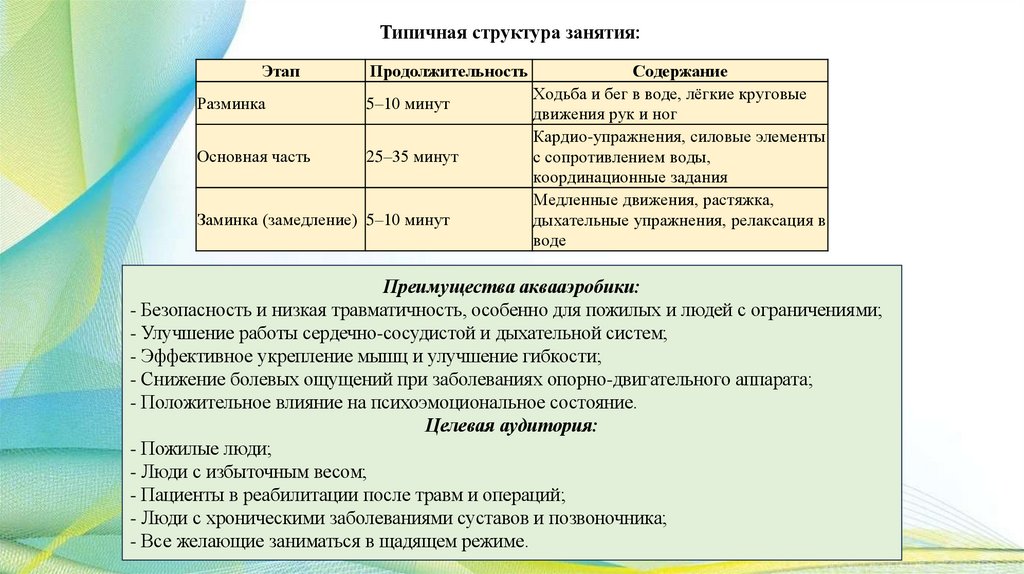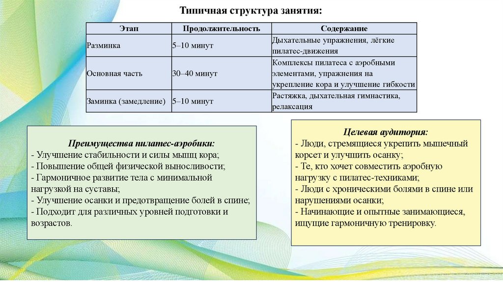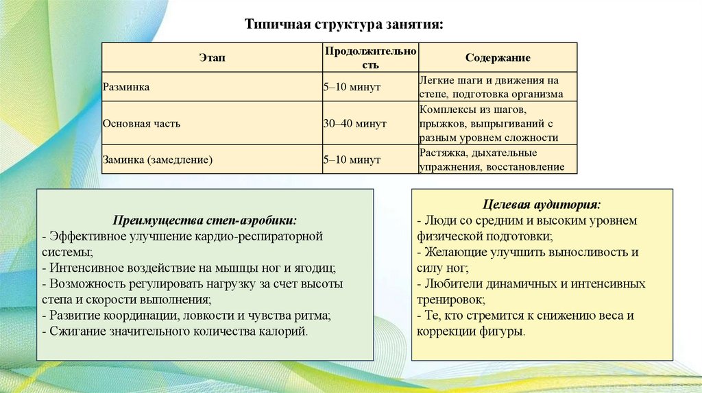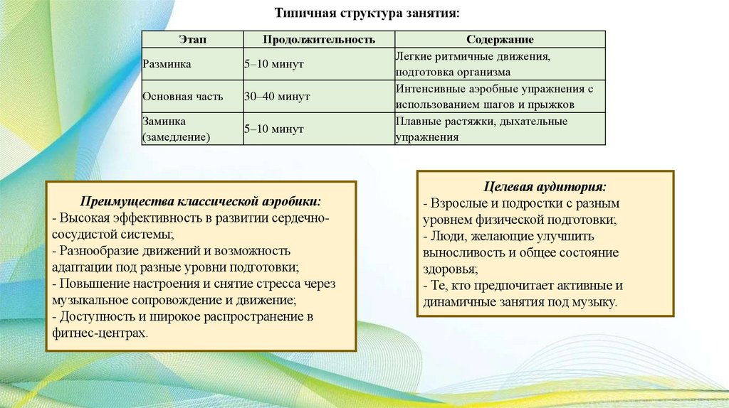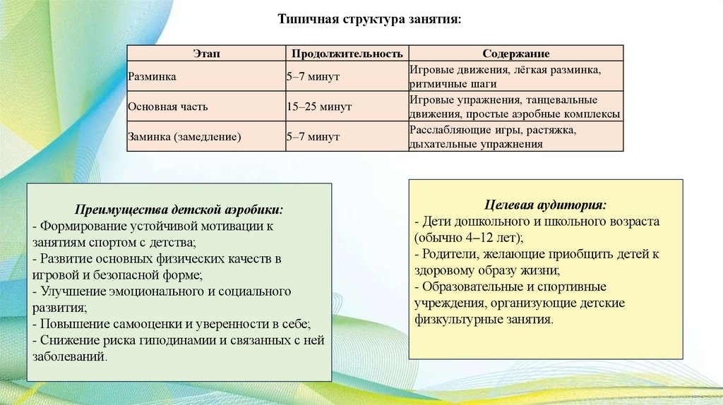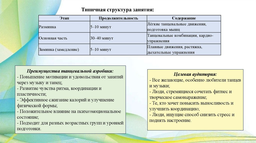 - Структура занятия обычно включает разминку, основную часть и заминку;