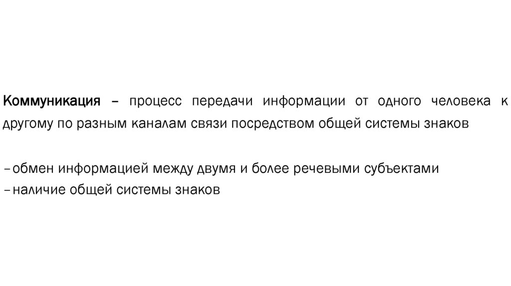 Коммуникация – процесс передачи информации от одного человека кдругому по разным каналам связи посредством общей системы знаков