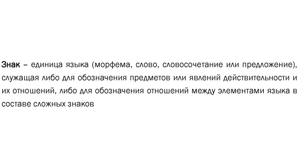 Знак – единица языка (морфема, слово, словосочетание или предложение),служащая либо для обозначения предметов или явлений действительности и