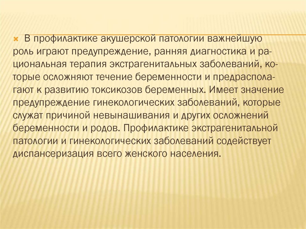 В профилактике акушерской патологии важнейшуюроль играют предупреждение, ранняя диагностика и рациональная терапия экстрагенитальных заболеваний, которые осложняют течение беременности и предрасполагают к развитию токсикозов беременных. Имеет значение
