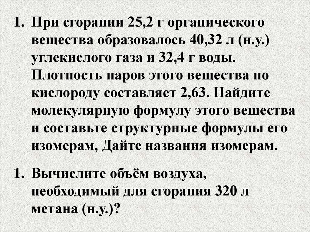 1. При сгорании 25,2 г органическоговещества образовалось 40,32 л (н.у.)