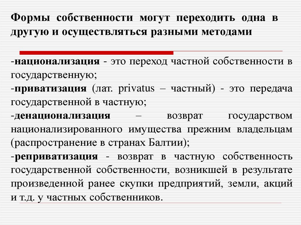 Формы собственности могут переходить одна вдругую и осуществляться разными методами