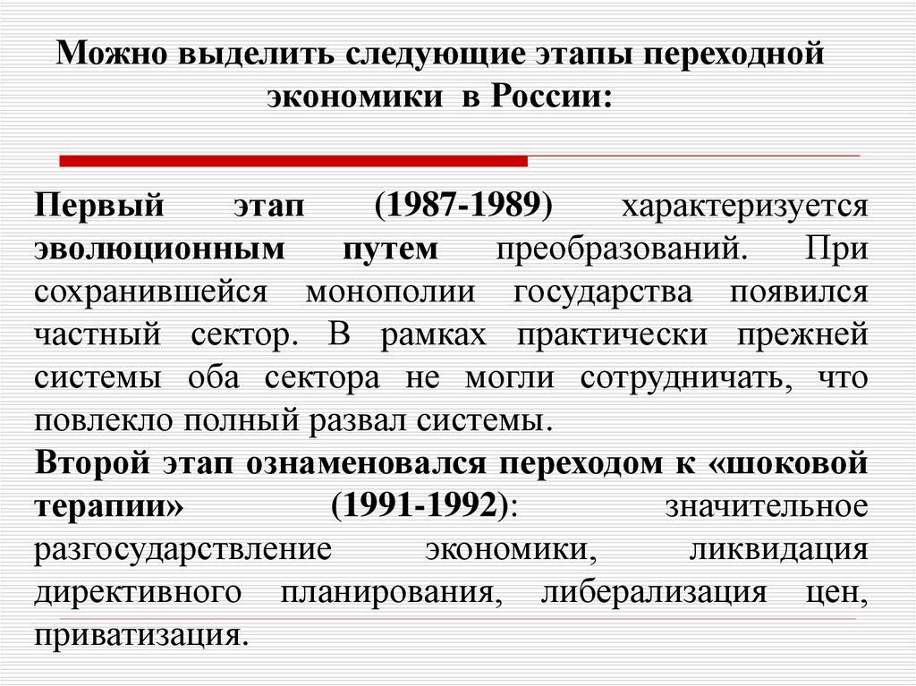 Можно выделить следующие этапы переходнойэкономики в России: