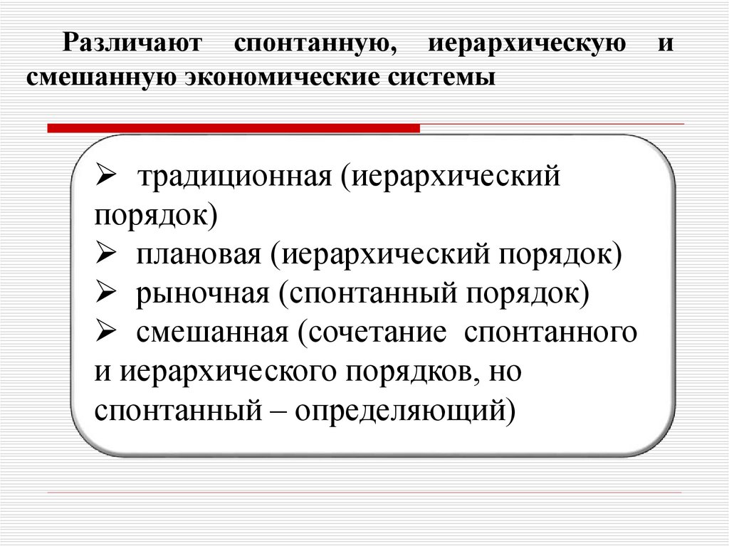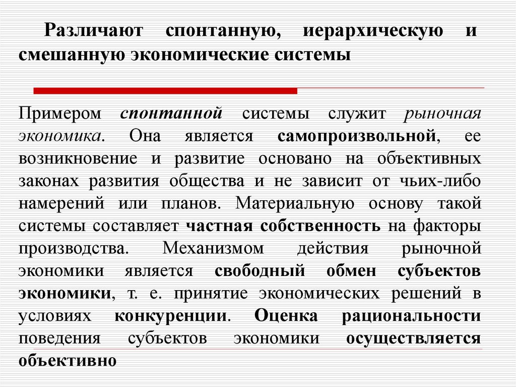 Различают спонтанную, иерархическуюсмешанную экономические системы