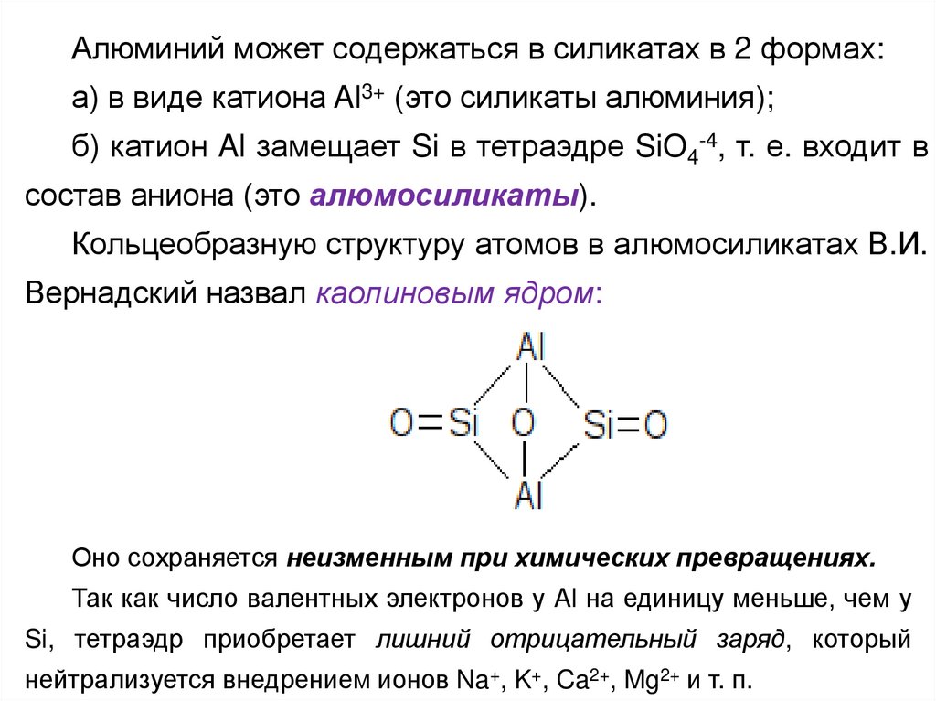Алюминий может содержаться в силикатах в 2 формах:а) в виде катиона Al3+ (это силикаты алюминия);