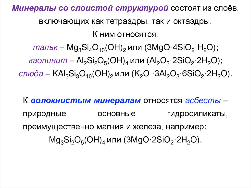 Минералы со слоистой структурой состоят из слоёв,включающих как тетраэдры, так и октаэдры.