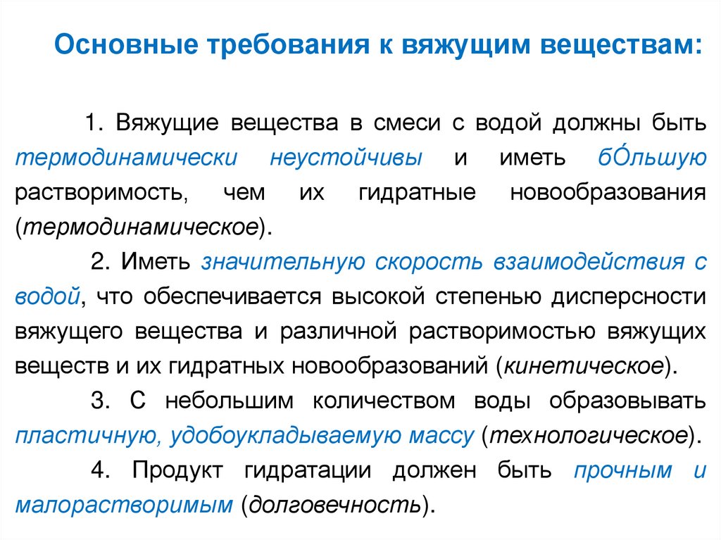 Основные требования к вяжущим веществам:1. Вяжущие вещества в смеси с водой должны быть