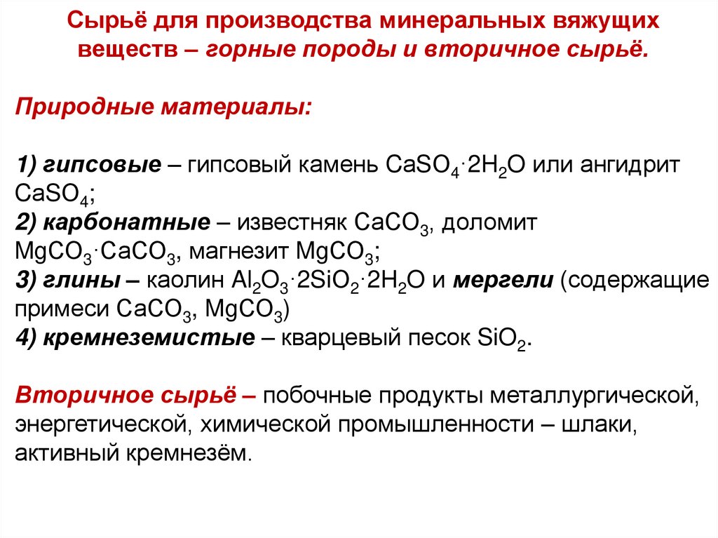 Сырьё для производства минеральных вяжущихвеществ – горные породы и вторичное сырьё.