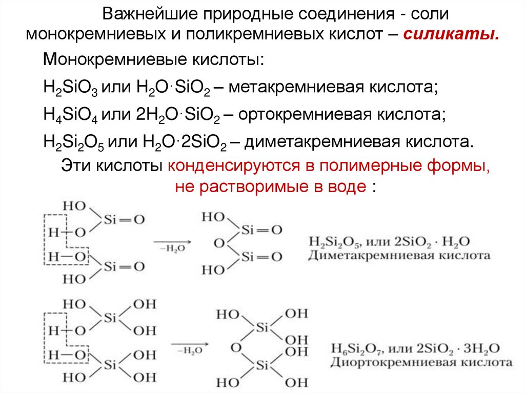 H4SiO4 или 2H2O·SiO2 – ортокремниевая кислота;