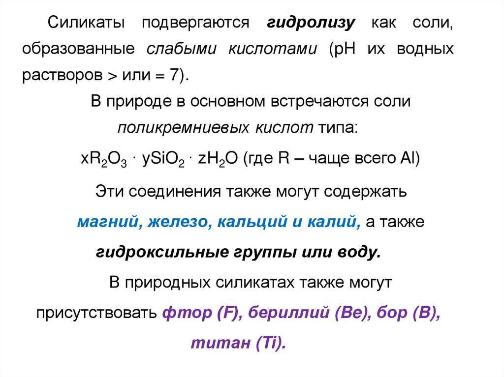 Силикаты подвергаются гидролизу как соли,образованные слабыми кислотами (pH их водных