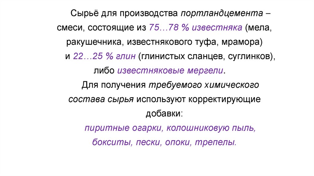 Сырьё для производства портландцемента –смеси, состоящие из 75…78 % известняка (мела,