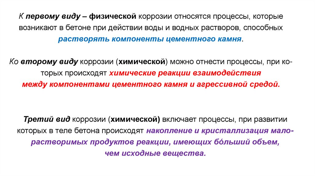 К первому виду – физической коррозии относятся процессы, которыевозникают в бетоне при действии воды и водных растворов, способных