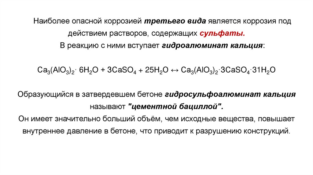 Наиболее опасной коррозией третьего вида является коррозия поддействием растворов, содержащих сульфаты.
