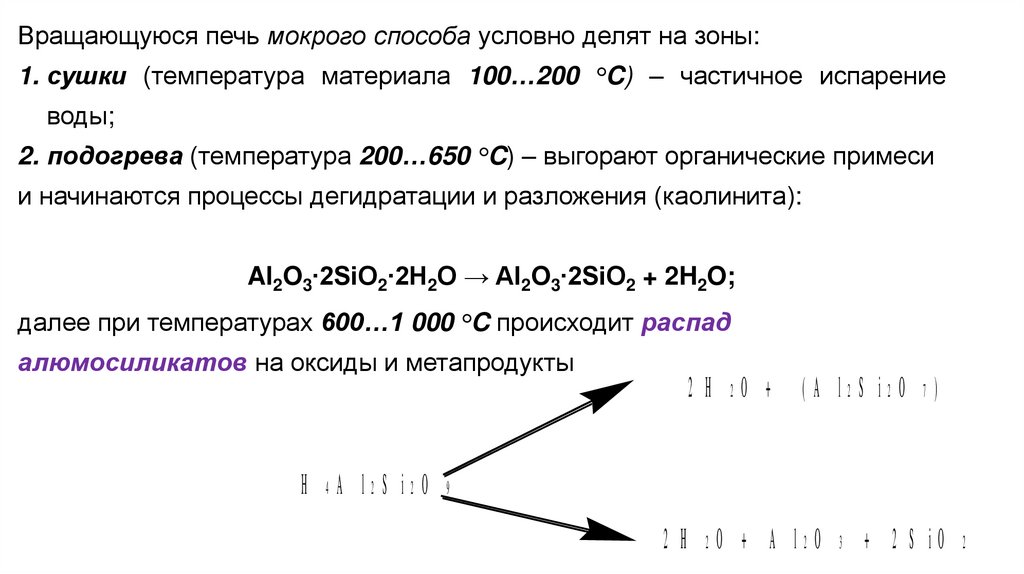Вращающуюся печь мокрого способа условно делят на зоны:1. сушки (температура материала 100…200 °C) – частичное испарение